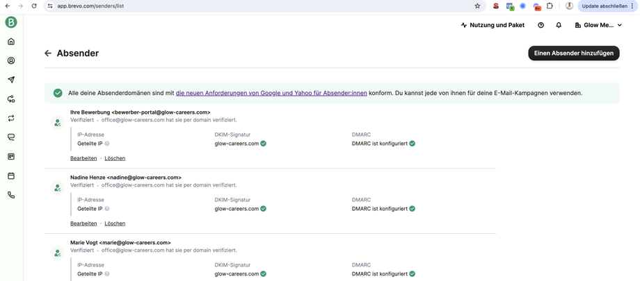 Hier siehst du nun alle bereits verbunden Postfächer. Klickst du auf den rechten oberen Button "Einen Absender hinzufügen" kannst du ein neues Postfach hinzufügen. Du verifizierst es durch einen Code den du an das entsprechende Postfach geschickt bekommst.